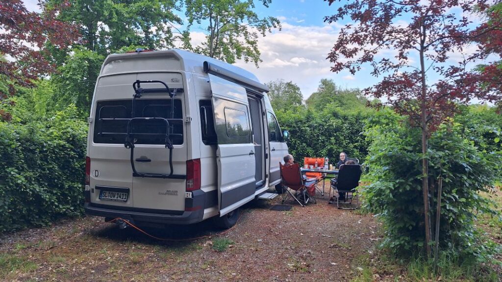 Wie gesagt, ein ganz normaler Wanderparkplatz mit Womo-Übernachtungs-Erlaubnis. Kein Strom, dafür mit Toilette in einigen hundert Metern Entfernung. Aber definitiv komfortabler als für die Jungs auf ihren Fahrrädern, die am Abend ihre Zelte auf dem Zeltplatz aufbauten. Zumal es in der Nacht auch noch anfing zu regnen…