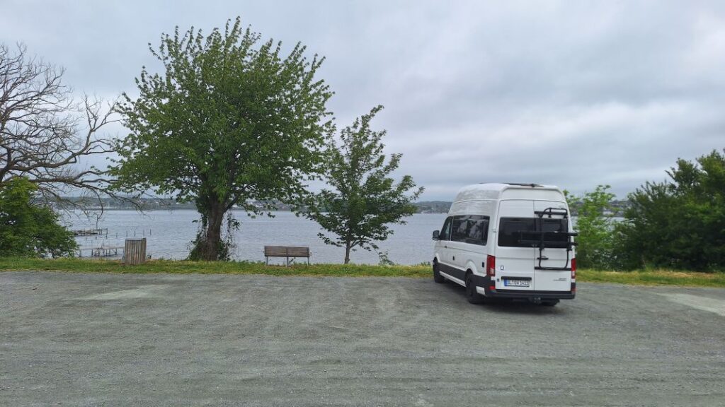 Als wir dort ankamen, war noch nicht viel los – lediglich einige PKW und ein weiteres Womo standen dort. Wir erwischten einen tollen Stellplatz mit direktem Blick auf den Fjord und die Stadt Kolding aus der Frontscheibe. Im Laufe des weiteren Nachmittags und Abends verließen uns die PKWs der Wanderer, und mehr und mehr Womos gesellten sich zu uns.