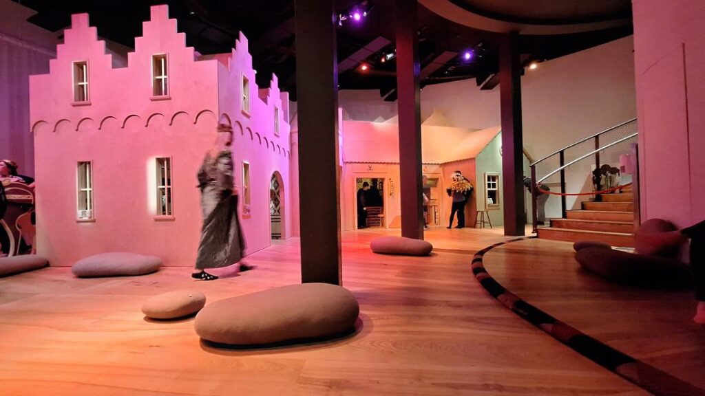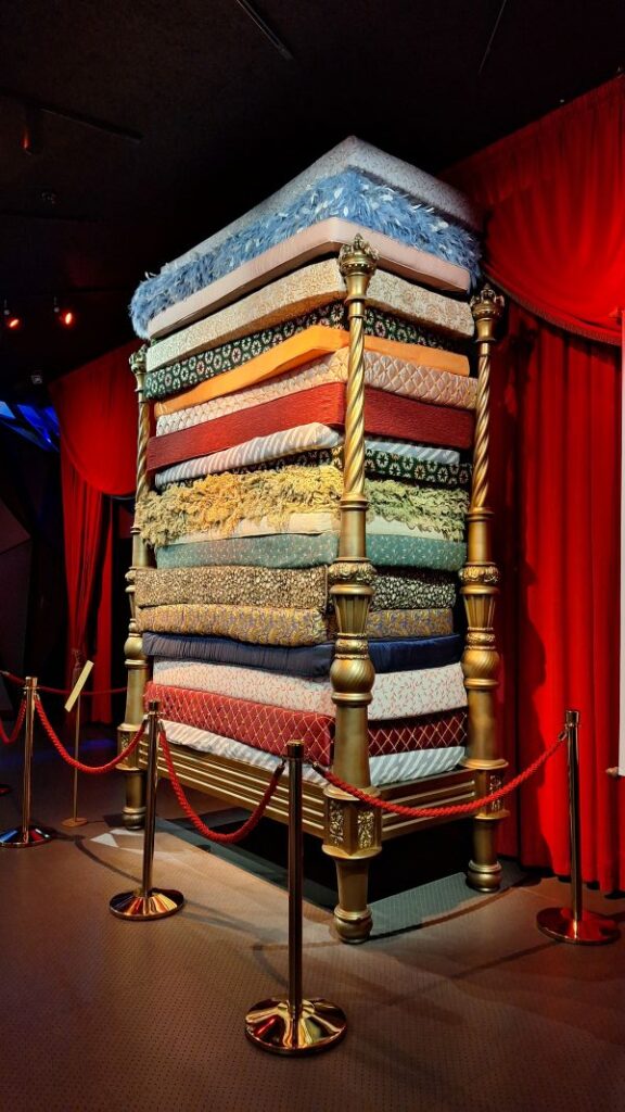 Beispielsweise 20 Originalmatratzen aus dem Königlichen Schloss zum Thema „Die Prinzessin auf der Erbse“, inklusive eben jener Erbse, präsentiert auf original königlichen Samtkissen, ebenso gespendet von der königlichen Familie. Ach ja, und die Erbse ist es auch, die im Audioguide die Geschichte von der Prinzessin aus ihrer Sicht erzählt …